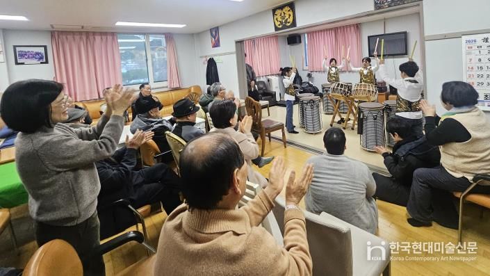 한국현대미술신문 배윤섭 기자 | 지난 24일, 수원특례시 영통구 매탄1동은 매탄1동지역사회보장협의체와 함께 현대힐스테이트경로당 자매결연 행사로 The꿈 지역아동센터 아동들이 준비한 난타공연을 선보였다.