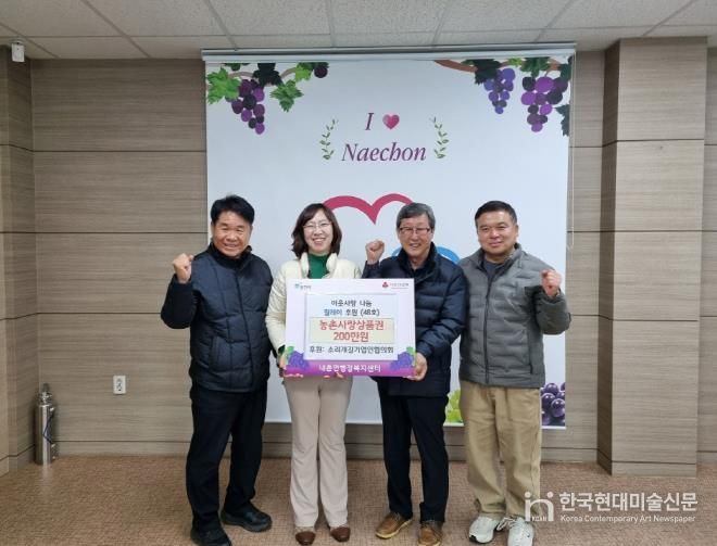 한국현대미술신문 배윤섭 기자 | 포천시 내촌면 행정복지센터는 지난 24일 소리개길기업인협의회가 농촌사랑상품권 200만 원 상당을 경기 사회복지공동모금회에 기탁하며 ‘이웃사랑 나눔 릴레이 48호’에 동참했다고 밝혔다.
