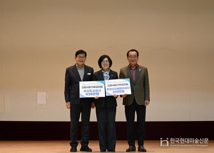 한국현대미술신문 배윤섭 기자 | 안성시시설관리공단은 안성시와 오산시의 상생협력과 지역경제 활성화를 목적으로 안성시설관리공단과 오산도시공사가 중점적으로 추진한'고향사랑기부제 상호기부 전달식'을 개최했다고 밝혔다.