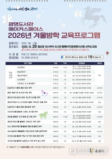한국현대미술신문 배윤섭 기자 | 광명시 광명도서관은 오는 29일부터 ‘메이커스페이스 2026년 겨울방학 교육 프로그램’ 참가자를 모집한다.
