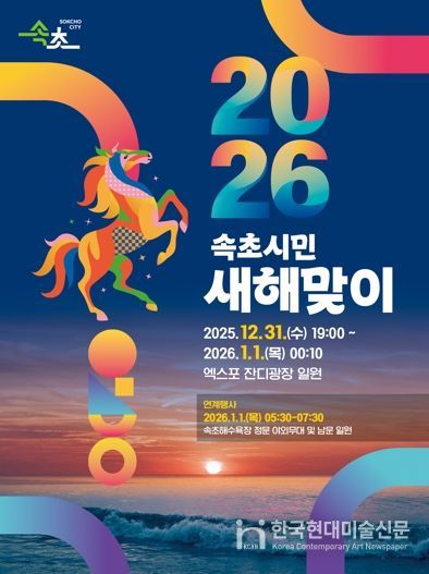 한국현대미술신문 원진 기자 | 속초시가 병오년 ‘붉은 말의 해’를 맞아 12월 31일(수) 저녁 7시부터 엑스포 잔디광장 일원에서 ‘2026 속초시민 새해맞이 행사’를 개최한다. 다채로운 프로그램이 이어지며 시민의 안녕과 희망찬 새해 출발을 기원하는 화합의 시간이 될 전망이다.