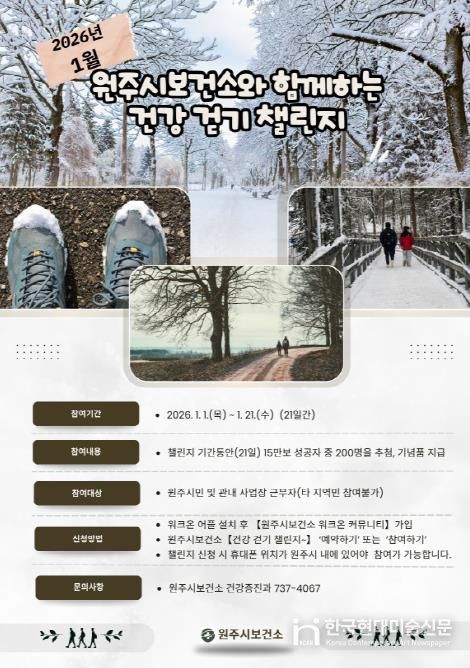 한국현대미술신문 원진 기자 | 원주시보건소는 새해를 맞아 보건소와 함께하는 1월 건강 걷기 챌린지를 운영한다.