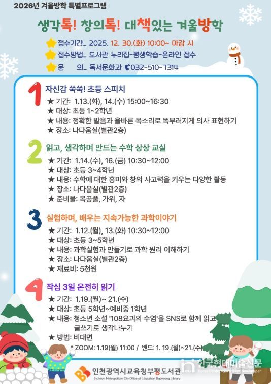 한국현대미술신문 박재남 기자 | 인천광역시교육청부평도서관은 겨울방학을 맞아 1월 한달간 새 학년을 준비하는 초등학생과 중학생을 대상으로 겨울방학 특별프로그램을 운영한다.