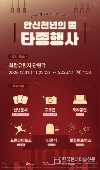 한국현대미술신문 배윤섭 기자 | 안산시는 오는 31일 오후 10시부터 화랑유원지 단원각에서 ‘2026 안산 천년의 종 타종 행사’를 개최한다고 30일 밝혔다.