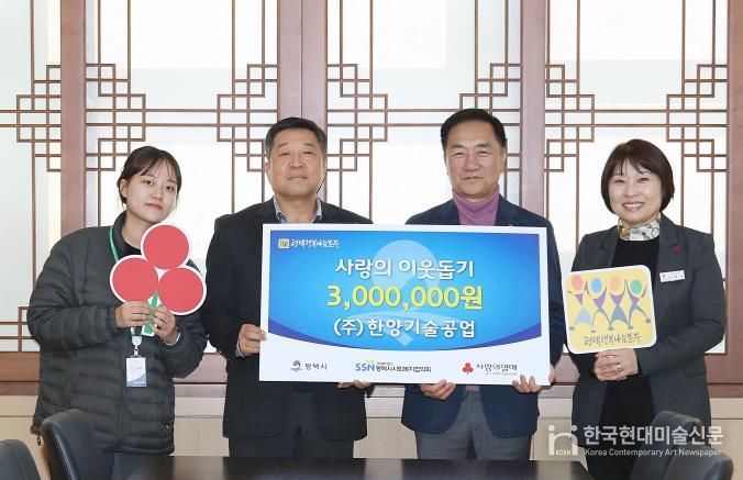 한국현대미술신문 배윤섭 기자 | 평택시 서탄면에 있는 ㈜한양기술공업은 관내 취약계층 지원을 위한 성금 300만 원을 평택시청 대외협력실에서 평택행복나눔본부에 전달했다.