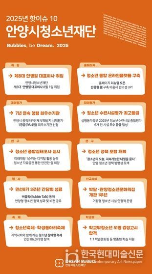 한국현대미술신문 배윤섭 기자 | 안양시청소년재단은 올 한 해를 돌아보는 ‘2025년 안양시 청소년재단 핫이슈 10’을 선정하고, 2025년 청소년 정책 컨트롤타워로서의 기능을 강화해 청소년 체감형 정책 성과를 거뒀다고 30일 밝혔다.