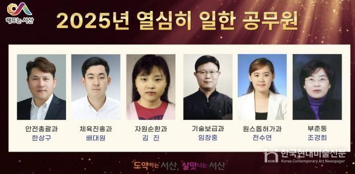한국현대미술신문 신정은 기자 | 충남 서산시는 올해 시정 발전과 시민 삶의 질 향상을 위해 노력한 공무원 6명을 ‘열심히 일한 공무원’으로 선정했다고 밝혔다.