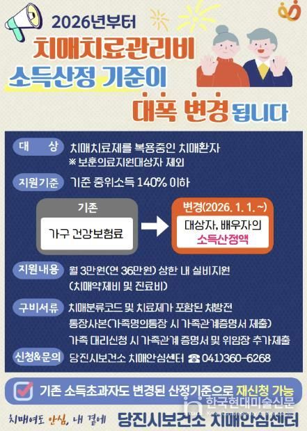 한국현대미술신문 신정은 기자 | 당진시보건소 치매안심센터는 2026년 1월 1일부터 치매치료관리비 지원사업의 소득 기준 산정 방법이 변경된다고 31일 밝혔다.