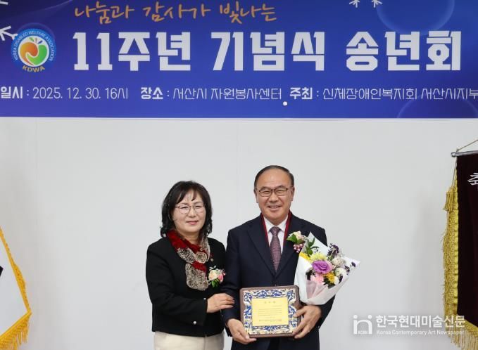 한국현대미술신문 신정은 기자 | 서산시의회 조동식 의장이 지난 30일 서산시자원봉사센터에서 열린 (사)충남신체장애인복지회 서산시지부 창립 제11주년 기념식 및 송년회에서 (사)한국신체장애인 충남복지회 서산시지부(지부장 최선아)로부터 감사패를 받았다.