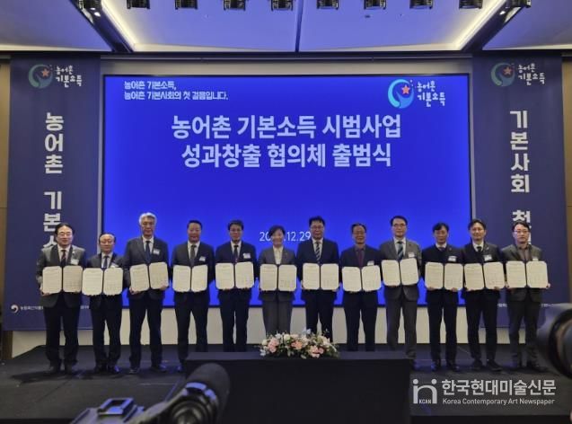 행사에서는 기본사회 강연을 시작으로 농어촌기본소득 시범사업 추진계획과 지역별 특화모델 운영 방향, 연구단 구성·운영 및 정책평가 계획이 공유됐다. 이어 농식품부–경인사연–10개 군이 참여하는 업무협약 체결과 협의체 출범 퍼포먼스, 기념촬영이 진행됐다.