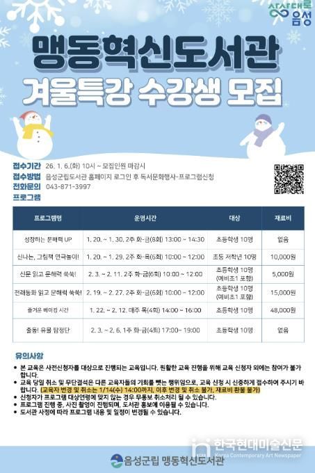 한국현대미술신문 신정은 기자 | 음성군 맹동혁신도서관은 겨울방학을 맞아 관내 초등학생들을 대상으로 겨울특강을 마련해 참여자를 모집한다.