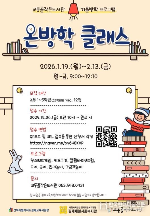 한국현대미술신문 기자 | 김제시는 교동골작은도서관이 겨울방학을 맞아 아동을 위한 특별 프로그램인 ‘온(溫)방학 클래스’를 운영한다고 밝혔다.