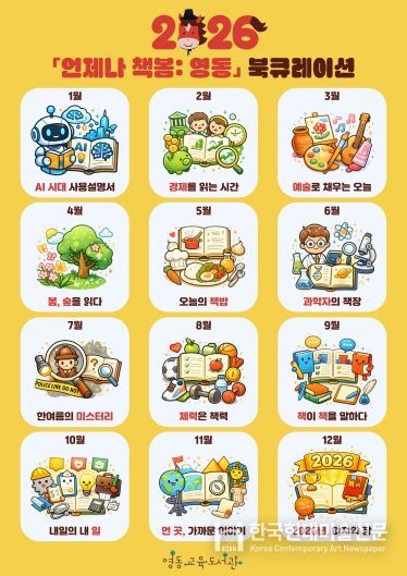 한국현대미술신문 신정은 기자 | 영동교육도서관은 2026년 1월부터 12월까지 '언제나 책봄: 영동' 북큐레이션을 운영한다. 매월 주제에 맞는 대상별 추천도서 32권을 전시하여 도서관 이용자에게 다양한 독서 경험을 제공하기 위함이다.
