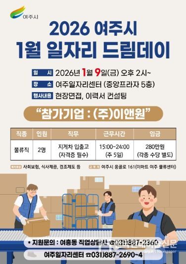 한국현대미술신문 배윤섭 기자 | 여주시는 오는 1월 9일 오후 2시 여주일자리센터(세종로 14번길 18, 중앙프라자 5층)에서 ‘2025년 첫 여주시 일자리드림데이’를 연다.