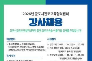 한국현대미술신문 배윤섭 기자 | (재)군포시청소년재단 군포시진로교육협력센터는 관내 청소년의 진로 탐색과 진로 역량 강화를 위해 '2026년 군포시진로교육협력센터 강사'를 채용한다고 밝혔다.