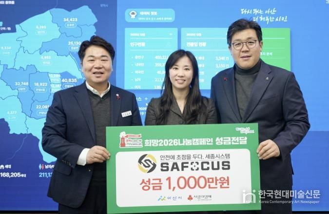 한국현대미술신문 신정은 기자 | ㈜세종시스템과 세이포커스(safocus)는 지난 6일 아산시를 방문해 희망2026나눔캠페인 성금 1천만 원을 기탁하며, 지역사회와 함께하는 나눔에 동참했다.