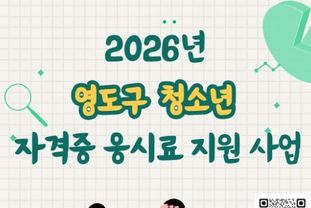 지원 대상은 영도구에 1년 이상 주민등록을 두고 거주하는 9세부터 18세(2008년~2017년생) 청소년으로, 2026년에 시행되는 국가기술자격, 국가공인자격, 민간자격 시험 응시료를 지원한다.