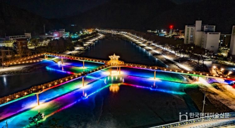 한국현대미술신문 신정은 기자 | 연일 이어진 한파로 괴산군 성황천과 동진천이 얼어붙은 가운데, 두 하천을 잇는 에코브릿지의 경관조명이 얼음 위에 반영돼 겨울밤 수변에 이색적인 풍경을 연출하고 있다.