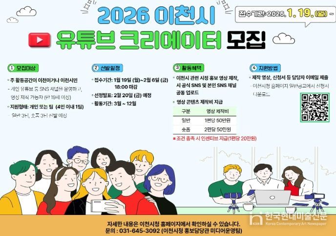 한국현대미술신문 배윤섭 기자 | 이천시는 오는 2월 6일까지 2026년 이천시 유튜브 영상크리에이터 3기를 모집한다고 9일 밝혔다.