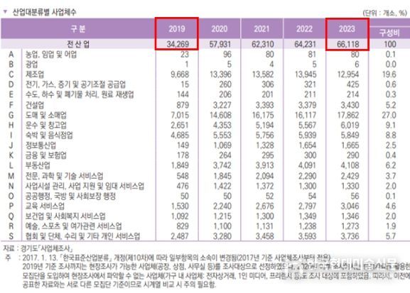 먼저, ▲기업체 분야를 살펴보면 2023년 기준 김포시 전체 사업체 수는 66,118개소로, 2019년 대비 31,849개소(92.9%↑)가 증가했다. 특히 에너지 산업(전기·가스 등) 분야의 성장세가 뚜렷했으며, 300~499명 규모의 중대형 사업체도 250% 늘어 지역 경제의 자족 기능이 강화되고 있는 것으로 분석된다.
