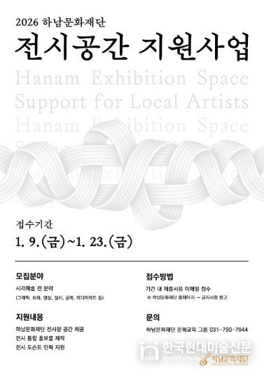 한국현대미술신문 배윤섭 기자 | (재)하남문화재단이 하남시를 기반으로 시각예술 분야에서 활동하는 지역 예술가를 지원하기 위해 '전시공간 지원사업' 참여 작가를 오는 23일까지 모집한다고 밝혔다.