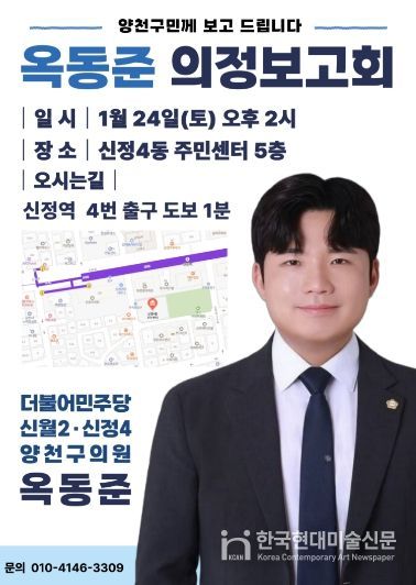한국현대미술신문 배윤섭 기자 | 양천구의회 옥동준 의원(더불어민주당, 신정4·신월2동)이 오는 24일 오후 2시 양천구 신정4동 주민센터에서 의정보고회를 열어 그간의 의정활동 성과와 향후 계획을 양천구민께 보고하는 자리를 마련한다.
