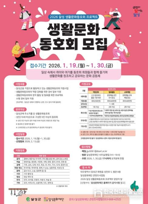 한국현대미술신문 정소영 기자 | (재)달성문화재단은 1월 19일부터 30일까지 ‘2026 달성 생활문화동호회 프로젝트’에 참여할 동호회를 모집한다고 9일 밝혔다.