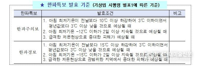 한파특보 중 ‘한파주의보’는 아침 최저기온이 전날보다 10℃ 이상 하강하여 3℃ 이하이면서 평년값보다 3℃ 이상 낮을 것으로 예상되거나 아침 최저기온이 전날보다 12℃ 이하인 날이 2일 이상 지속될 것으로 예상될 때 발효된다.