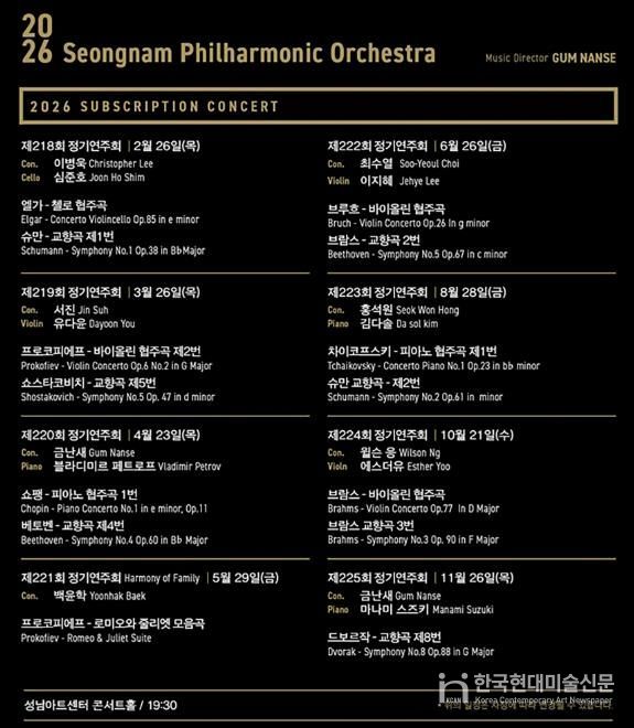 한국현대미술신문 배윤섭 기자 | 2026년 창단 23주년을 맞는 성남시립교향악단은 해마다 다양한 연주자와 수준높은 프로그램으로 끊임없이 매진 행렬을 이어가고 있다.