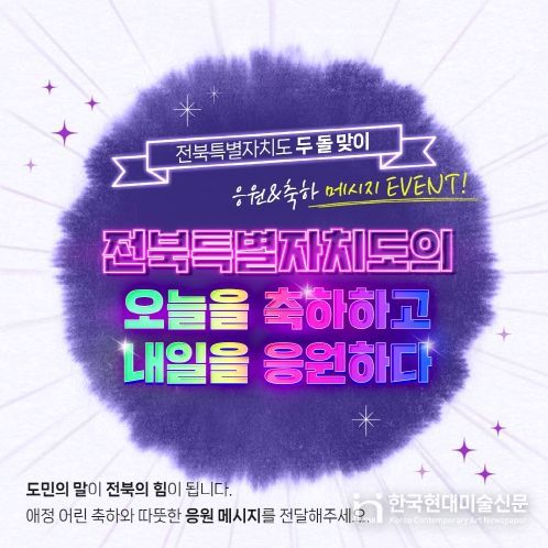 한국현대미술신문 기자 | 전북특별자치도는 출범 2주년을 맞아 도민이 직접 참여하는 '도민 참여 축하·응원 메시지 이벤트'를 1월 12일부터 23일까지 운영한다.