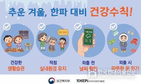 겨울철 한파 대비 건강 수칙으로는 △실내 적정 온도(18~20℃) 및 습도(40~60%) 유지 △ 외출 전 체감온도 확인 △ 외출 시 방한용품 착용 등이 있다.