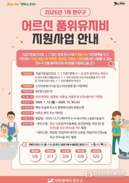 한국현대미술신문 박재남 기자 | 연수구가 병오년 새해부터 지역 내 70세 이상의 어르신들에게 연간 12만 원의 품위유지비를 지원하는 사업을 진행한다.
