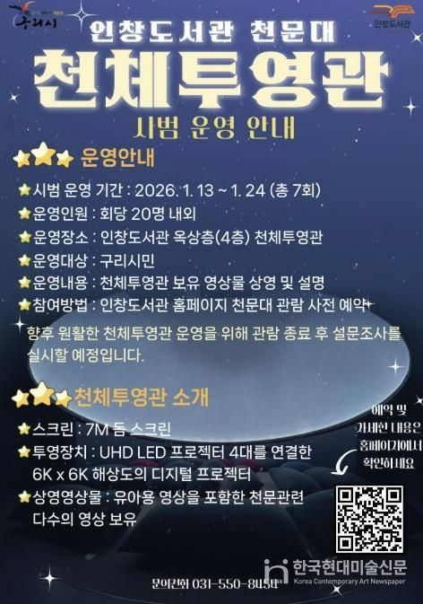 한국현대미술신문 배윤섭 기자 | 구리시는 오는 1월 13일부터 24일까지 인창도서관 옥상에 설치된 천체투영관의 시범운영을 실시한다고 밝혔다.