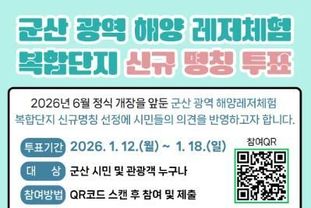 군산시 관계자는 “군산 광역 해양레저체험 복합단지는 시민을 위한 공공시설인 만큼, 명칭 선정 과정에서도 시민의 의견을 폭넓게 반영하고자 한다.”라며 “시민 참여 선호도 조사 40%, 심사위원 평가 60%의 혼합형 심사 방식을 통해 공정성과 전문성을 함께 확보한 만큼, 많은 시민의 적극적인 참여를 기대한다.”라고 밝혔다.
