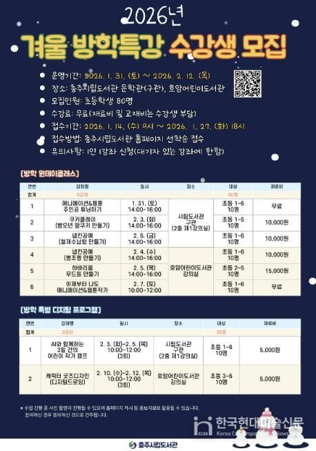 한국현대미술신문 신정은 기자 | 충주시립도서관은 겨울방학을 맞아 관내 초등학생을 대상으로 겨울 방학특강 수강생을 모집한다고 13일 밝혔다.