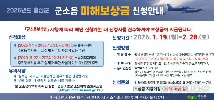 한국현대미술신문 원진 기자 | 횡성군은 오는 19일부터 내달 28일까지 ‘2026년 군용기 소음피해 보상금’ 신청을 접수한다고 밝혔다.