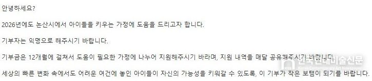 한편, 2020년 시작된 익명 기부자의 선행은 매년 논산시의 겨울을 녹이는 대표적인 미담으로 자리 잡았다. 시는 기부금 전달 과정에서 기부자의 익명성을 철저히 보장하면서도 그 따뜻한 영향력이 지역사회 전반으로 퍼져나갈 수 있도록 노력하고 있다.