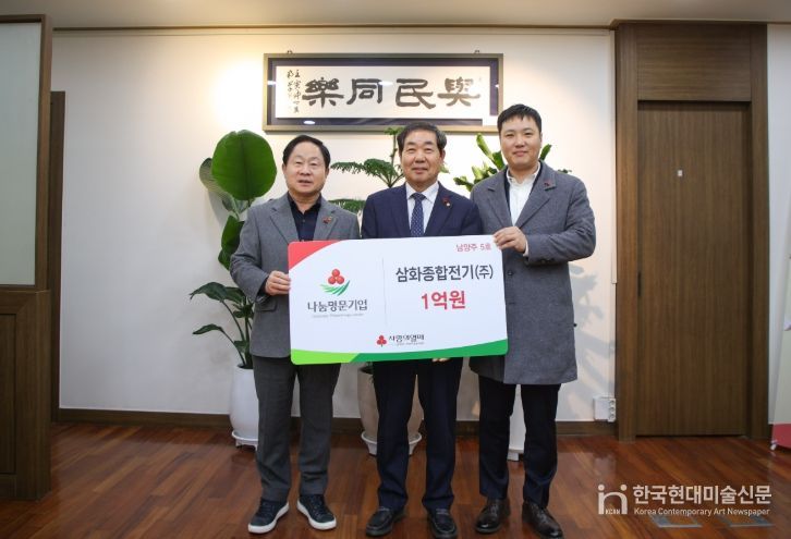 한국현대미술신문 배윤섭 기자 | 남양주시는 14일 삼화종합전기가 사회복지공동모금회의 고액 기부 프로그램인 ‘나눔명문기업’ 5호로 가입하고, 지역 내 취약계층 지원을 위해 1억 원 기부를 약정했다고 밝혔다.