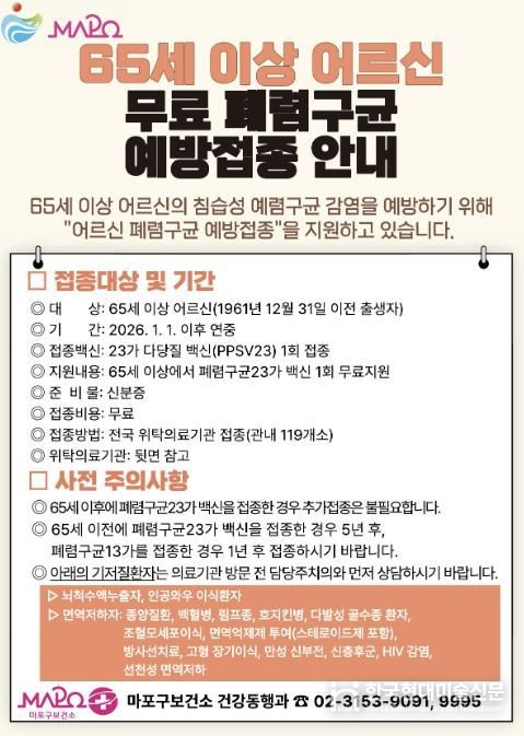박강수 마포구청장은 “폐렴구균 감염은 면역력이 저하된 고령층에서 중증으로 이어지기 쉬운 만큼 65세 이상 어르신에게 예방접종이 꼭 필요하다”라며, “대상 어르신들께서는 가까운 의료기관을 통해 무료 접종을 받으시고 건강한 일상을 이어가시길 바란다”라고 말했다.