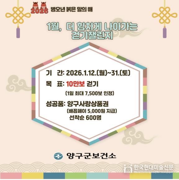 한국현대미술신문 원진 기자 | 양구군이 군민의 일상 속 신체활동 증진과 건강한 생활습관 형성을 위해 2026년 모바일 걷기 앱 ‘워크온(WalkOn)’을 활용한 걷기 챌린지를 연중 운영한다.