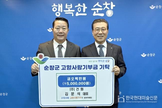 한국현대미술신문 기자 | 순창군은 15일 ㈜건화 김문석 대표이사가 순창군에 고향사랑기부금 500만원을 기탁했다고 밝혔다.