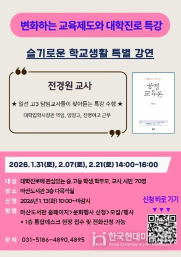한국현대미술신문 배윤섭 기자 | 김포시 마산도서관이 1월 31일, 2월 7일, 2월 21일 2월 21일 3회에 걸쳐 오후 2시부터 4시까지 ‘변화하는 교육환경(슬기로운 학교생활)’에 관심이 있는 중고등학교 학부모, 교사, 학생 등 김포시민을 대상으로 특별강연을 운영한다.