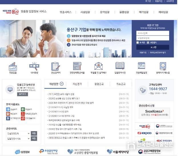 한국현대미술신문 배건 기자 | 서울 용산구가 2026년에도 ‘맞춤형 입찰정보시스템’을 운영해 지역 내 중소기업·소상공인이 관심 분야의 공공입찰 정보를 빠르고 정확하게 받아볼 수 있도록 지원한다. 정보 탐색 부담을 줄이고 공공조달 참여를 촉진해 지역 기업들의 판로를 개척하고 지역경제를 활성화하기 위한 취지다.