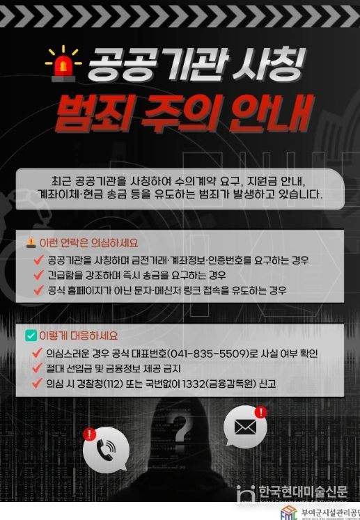 한국현대미술신문 신정은 기자 | 부여군시설관리공단은 최근 공공기관을 사칭해 물품 대리구매나 수의계약을 가장하고 선입금을 요구하는 사기 시도가 발생하고 있다며, 관내 업체와 협력사를 대상으로 각별한 주의를 당부했다.