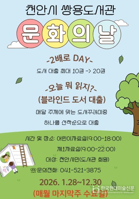 한국현대미술신문 신정은 기자 | 천안시 쌍용도서관은 매달 마지막주 수요일 ‘2026 문화가 있는 날’ 행사를 운영한다고 16일 밝혔다.
