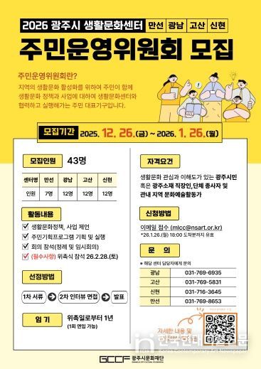한국현대미술신문 배윤섭 기자 | (재)광주시문화재단은 광주시 생활문화센터(만선·광남·고산·신현)에서 2026년에 활동할 주민운영위원회 위원을 통합 공개 모집한다고 밝혔다.