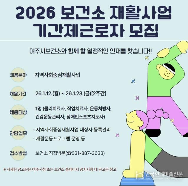 한국현대미술신문 배윤섭 기자 | 여주시보건소는 지역 내 등록장애인과 예비장애인들의 건강관리를 위한 지역사회중심재활사업 추진을 위해 1월 12일부터 1월 23일까지 2주간 기간제근로자 채용 공고를 실시한다.