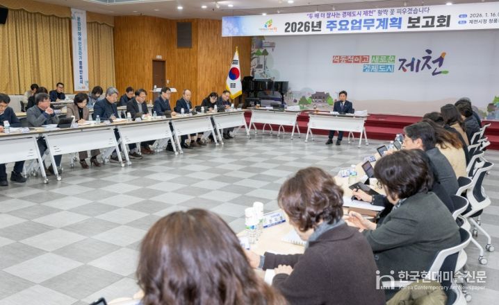 한국현대미술신문 신정은 기자 | 제천시는 지난 16일 시청 청풍호실에서 전 부서가 참여하는 ‘2026년 주요업무계획 보고회’를 개최하고, 새해 시정 운영 방향과 핵심사업 전반을 점검했다.