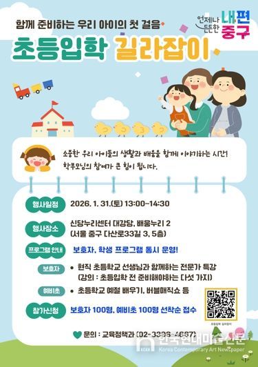 한국현대미술신문 배건 기자 | 서울 중구가 ‘2026 초등입학 길라잡이’ 설명회를 오는 31일 오후1시부터 신당누리센터 대강당에서 개최한다. 예비 초등학생과 학부모를 대상으로 약 1시간 반 동안 현직 교사가 첫 학교생활에 대한 궁금증을 해소해 줄 예정이다.