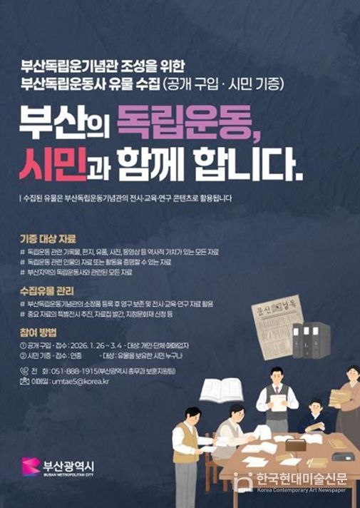 한국현대미술신문 정소영 기자 | 부산시는 2027년 상반기 개관을 목표로 조성 중인 부산독립운동기념관의 전시·연구·교육 콘텐츠를 완성하기 위해, 부산 독립운동사 관련 유물 수집을 추진한다고 밝혔다.